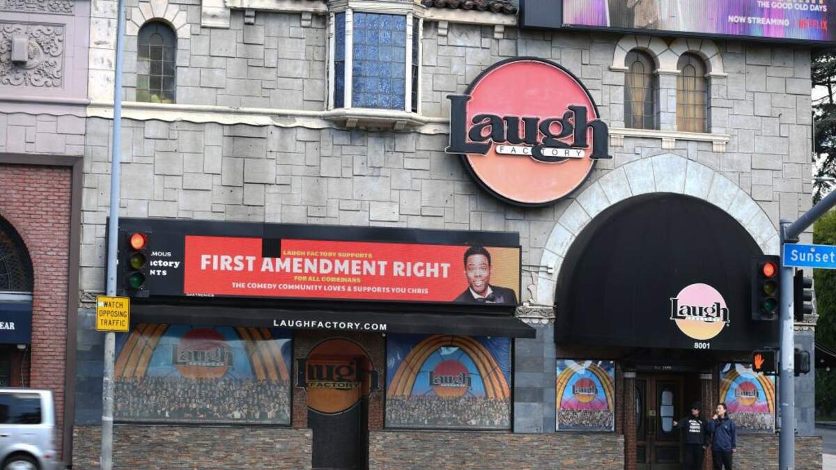 The Laugh Factory in Hollywood is showing their support of comedian Chris Rock with an image of him on a marquee saying "Laugh Factory supports First Amendment right for all comedians. The comedy community loves & supports you Chris."